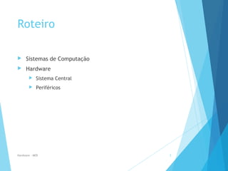 O documento discute os componentes fundamentais do hardware de computadores, incluindo: (1) o sistema central composto por CPU, ULA e memória principal; (2) diferentes tipos de memória como RAM, ROM e memória auxiliar; e (3) periféricos de entrada e saída.