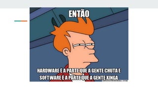 O documento discute a diferença entre hardware e software, tipos de softwares aplicativos e sistemas operacionais. Explica que hardware são os componentes físicos do computador enquanto software são programas criados para executar tarefas. Detalha softwares aplicativos como o Pacote Office e sistemas operacionais populares como Windows, Linux, Mac OS e Android.