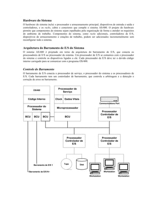 1) O documento descreve a arquitetura do sistema AS/400, incluindo suas camadas de hardware, software e interfaces. 2) A arquitetura isola os usuários dos detalhes do hardware através de camadas e fornece uma interface de máquina de alto nível. 3) O sistema usa objetos e armazenamento compartilhado para distribuir recursos de forma flexível e eficiente.