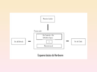 O documento descreve os principais componentes de hardware de um computador, incluindo a unidade de processamento (CPU), memória primária e secundária, e periféricos de entrada/saída. A CPU é composta pela unidade de controle, unidade lógica e aritmética e registradores. A memória pode ser primária (RAM e ROM) ou secundária (HD, CD, pendrive). Exemplos de periféricos são teclado, mouse, impressora e monitor.