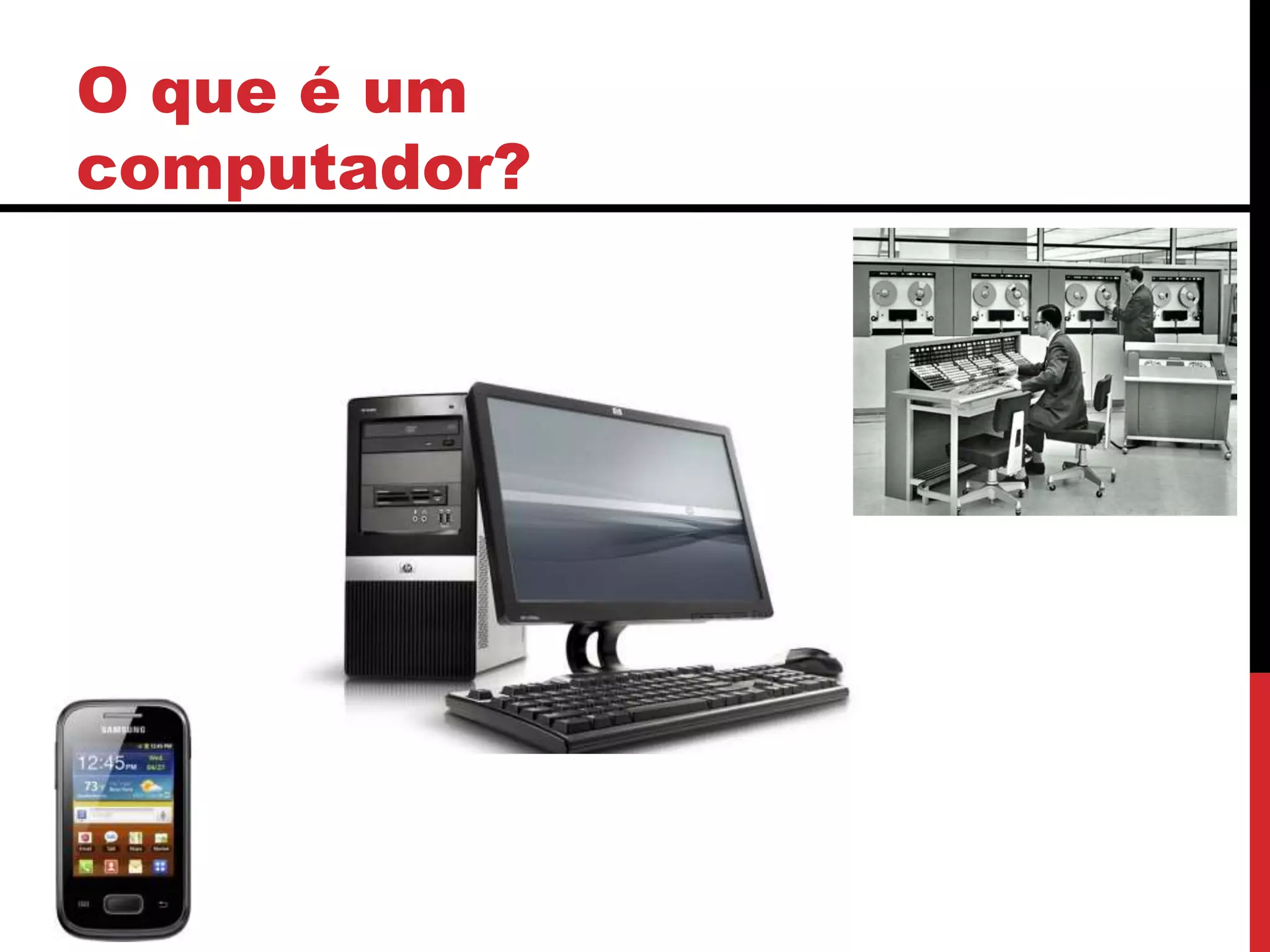 O documento descreve os principais componentes de um sistema computacional, incluindo hardware e software. O hardware é composto por unidades de processamento, memória e dispositivos de entrada e saída. O software inclui sistemas operacionais, programas e aplicativos. O documento também explica como os dados fluem através desses componentes, desde a entrada até o armazenamento e saída.