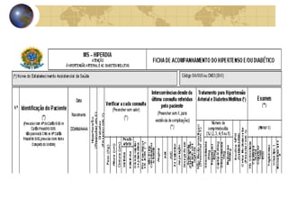 O documento discute o Sistema HiperDia, um software para cadastro e acompanhamento de pacientes hipertensos e diabéticos no SUS. O sistema permite monitorar pacientes, gerar informações para aquisição de medicamentos e é propriedade do Ministério da Saúde para uso exclusivo na rede pública.