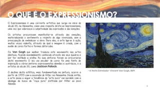 O expressionismo é uma corrente artística do início do século XX que enfatiza a subjetividade e as emoções, utilizando cores vibrantes e formas distorcidas. Edvard Munch, destacado representante do movimento, é conhecido por obras como 'O Grito', que expressa angústia e desespero inspirados em sua vida pessoal. O movimento declinou com a ascensão de Hitler em 1933, que promoveu a 'arte pura' e buscou suprimir estilos que não se alinhavam com sua ideologia.