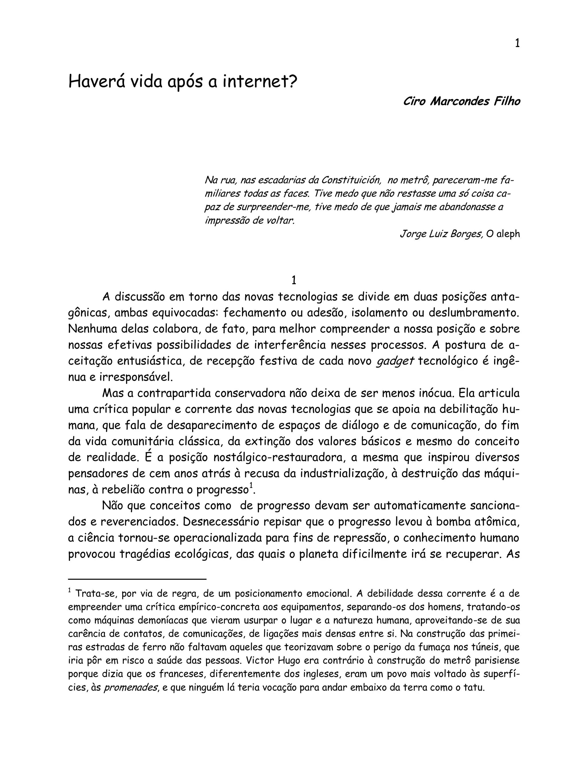 1) O texto discute as posições extremadas em relação às novas tecnologias, seja de aceitação entusiástica ou rejeição conservadora.