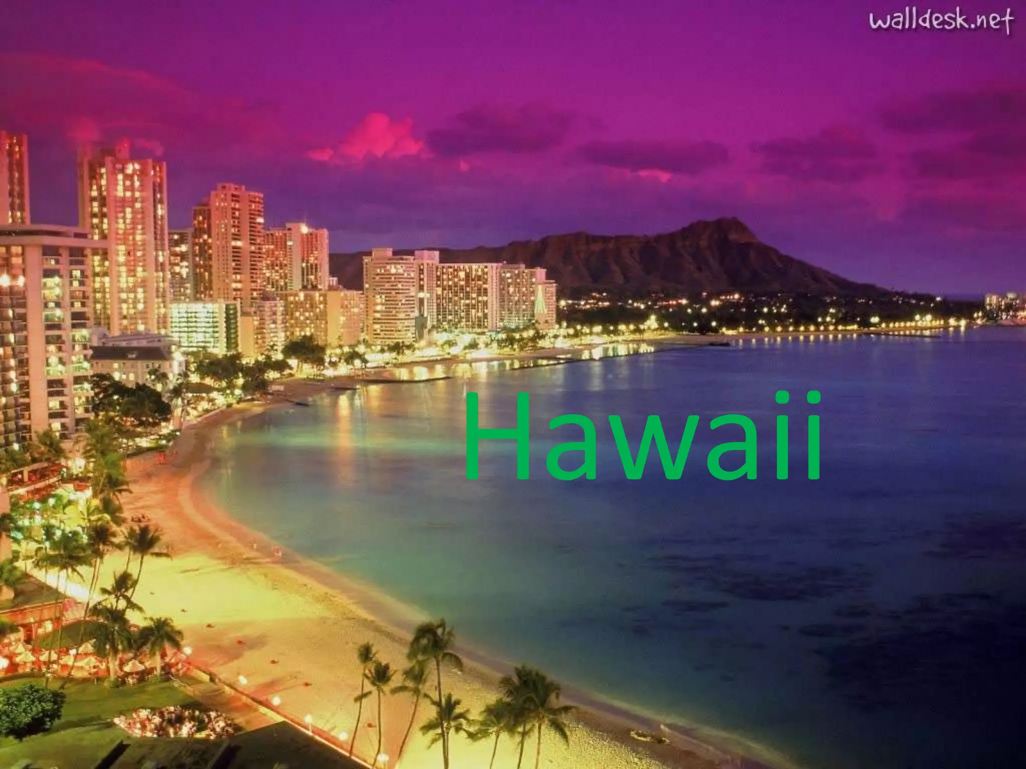 O Hawaii é um estado dos EUA localizado no meio do Oceano Pacífico, conhecido por suas praias paradisíacas, florestas luxuriantes e vulcões ativos. Sua economia baseia-se no turismo e atrações incluem o Parque Nacional dos Vulcões do Havaí e atividades como surfar, observação de baleias e festas típicas locais.