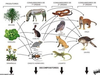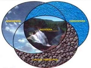 O documento discute conceitos-chave da ecologia, incluindo habitat, nicho ecológico, biosfera, litosfera, hidrosfera, atmosfera, cadeia alimentar e teia alimentar. Explica que o habitat é onde uma espécie vive, enquanto o nicho ecológico é como um organismo obtém recursos e se relaciona com o ambiente. A biosfera inclui todos os ecossistemas da Terra que suportam a vida.