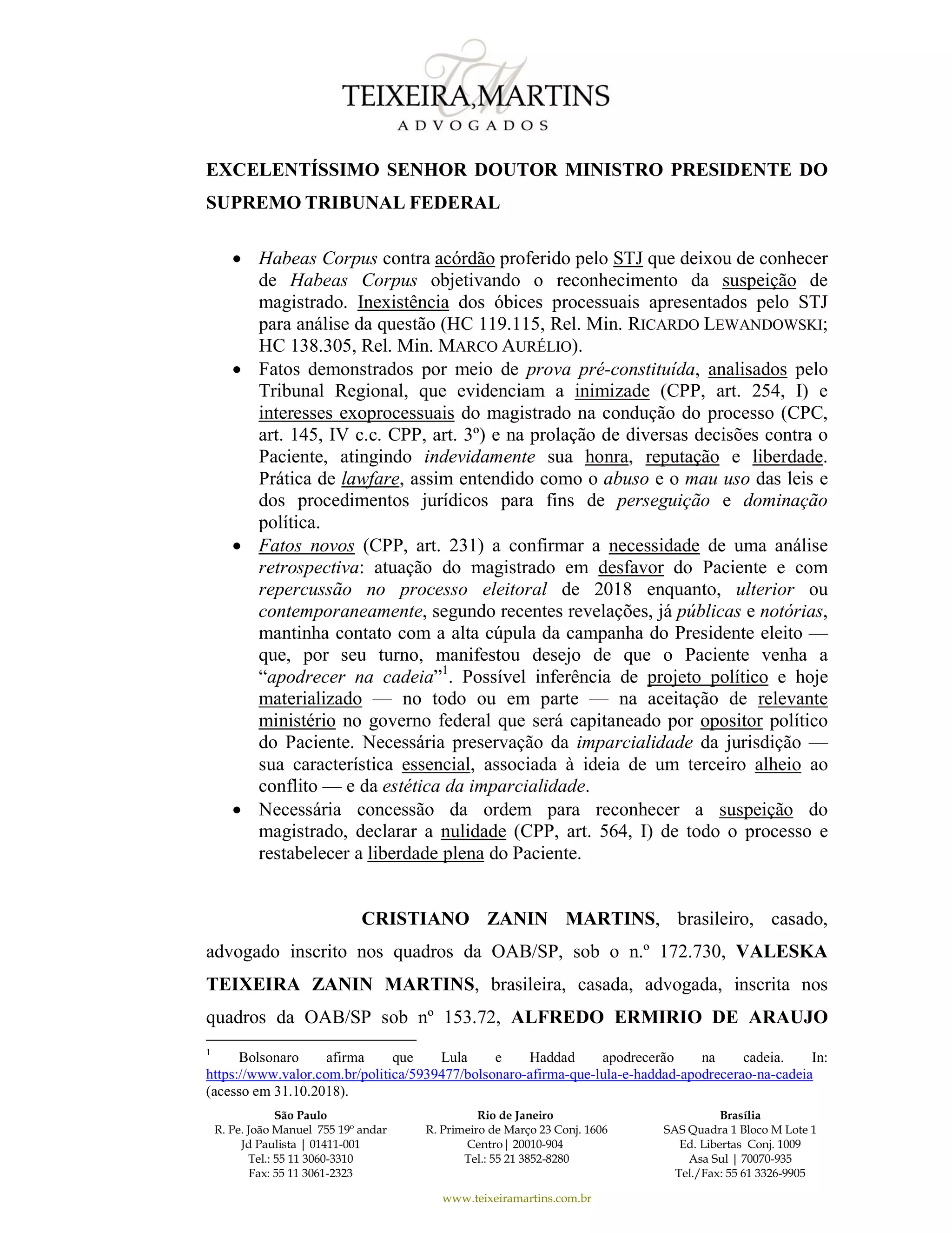 O documento é um pedido de habeas corpus impetrado junto ao STF contra decisão do STJ que não reconheceu a suspeição do juiz Sérgio Moro no processo contra Lula. Alega-se que há fatos pré-constituídos que demonstram a parcialidade do magistrado, notadamente sua atuação desfavorável a Lula e contatos com a campanha do então candidato Jair Bolsonaro. Pede-se o reconhecimento da suspeição e anulação de todo o processo para restabelecer a liberdade de Lula.