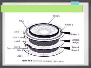 O documento descreve a evolução dos hard disks (HDs) desde o primeiro modelo de 5MB lançado pela IBM em 1956, que pesava uma tonelada, até os modelos atuais SATA, mais rápidos e com cabos mais finos. Também explica as unidades de medida do armazenamento digital e os principais tipos de interface para HDs: IDE, PATA e SATA.