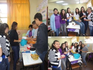 Os alunos da 9a série estão aprendendo a importância de uma dieta saudável rica em nutrientes por meio de um projeto interdisciplinar desenvolvido pela professora de Inglês, Cristina, que culmina com uma salada de frutas. Os alunos também elaboraram um dicionário de alimentos em português e inglês e cartazes sobre uma alimentação saudável.