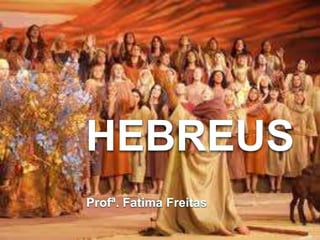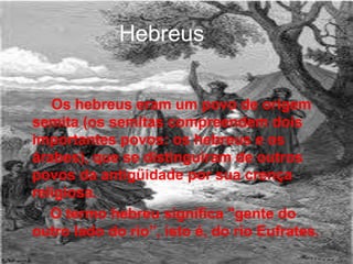 Os hebreus eram um povo semita que se estabeleceu na Palestina por volta de 2000 a.C. sob a liderança dos patriarcas Abraão, Isaac e Jacó. Eles desenvolveram o monoteísmo e influenciaram as religiões posteriores do cristianismo e islamismo. Após períodos de reinos unificados e divididos, os hebreus foram dispersos no mundo em eventos como o Cativeiro da Babilônia e as Diásporas.