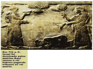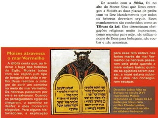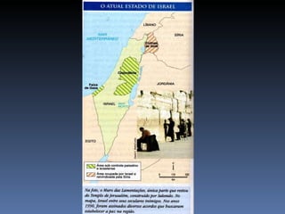 O documento resume a história e cultura do povo hebreu, incluindo sua localização original na Palestina antiga, os principais eventos políticos como o Êxodo e os reinos de Israel e Judá, sua diáspora pelo mundo, evolução econômica de nômade para sedentária, estrutura social e religião monoteísta baseada no Antigo Testamento e festividades como a Páscoa.