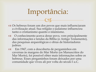 O documento descreve o povo hebreu, originário da Mesopotâmia. Os hebreus migraram para o Egito e foram libertados por Moisés, estabelecendo as bases do monoteísmo e do judaísmo. Após um período de reinos divididos, os hebreus foram conquistados e dispersos, retornando à Palestina em 1948 com a criação do Estado de Israel.