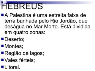 1) Os hebreus se originaram na Palestina e foram o primeiro povo monoteísta da história. Sua organização política evoluiu de clãs patriarcais para reinos, primeiro sob juízes e depois sob reis.