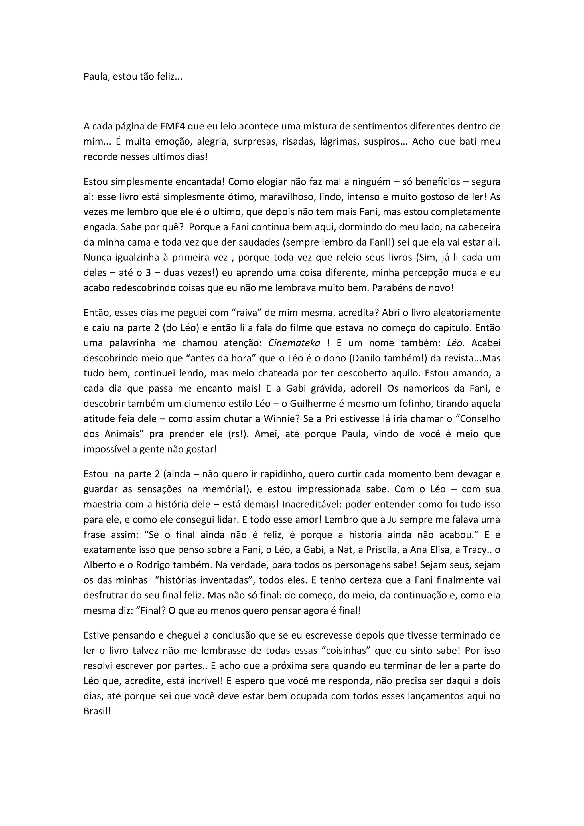 A leitora está muito feliz ao ler o livro Fazendo Meu Filme 4 e se encantar com a história de amor entre a Fani e o Léo. Ela se emociona com as reviravoltas da trama e se inspira a continuar escrevendo sua própria história. Ao terminar de ler, sente saudades dos personagens, mas celebra o "final feliz" que acredita que eles terão.