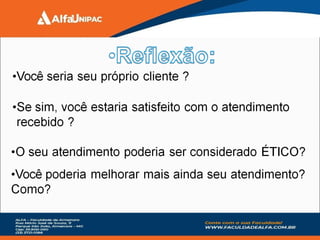 O documento aborda a importância do atendimento ao cliente, destacando a responsabilidade e o estado de espírito em proporcionar um serviço de qualidade. Enfatiza a necessidade de ouvir, orientar e tratar os clientes com respeito, além de apresentar estratégias para lidar com diferentes tipos de clientes. Por fim, menciona que a falta de atenção é uma das principais razões para a perda de clientes, ressaltando que um atendimento excelente ultrapassa as expectativas.