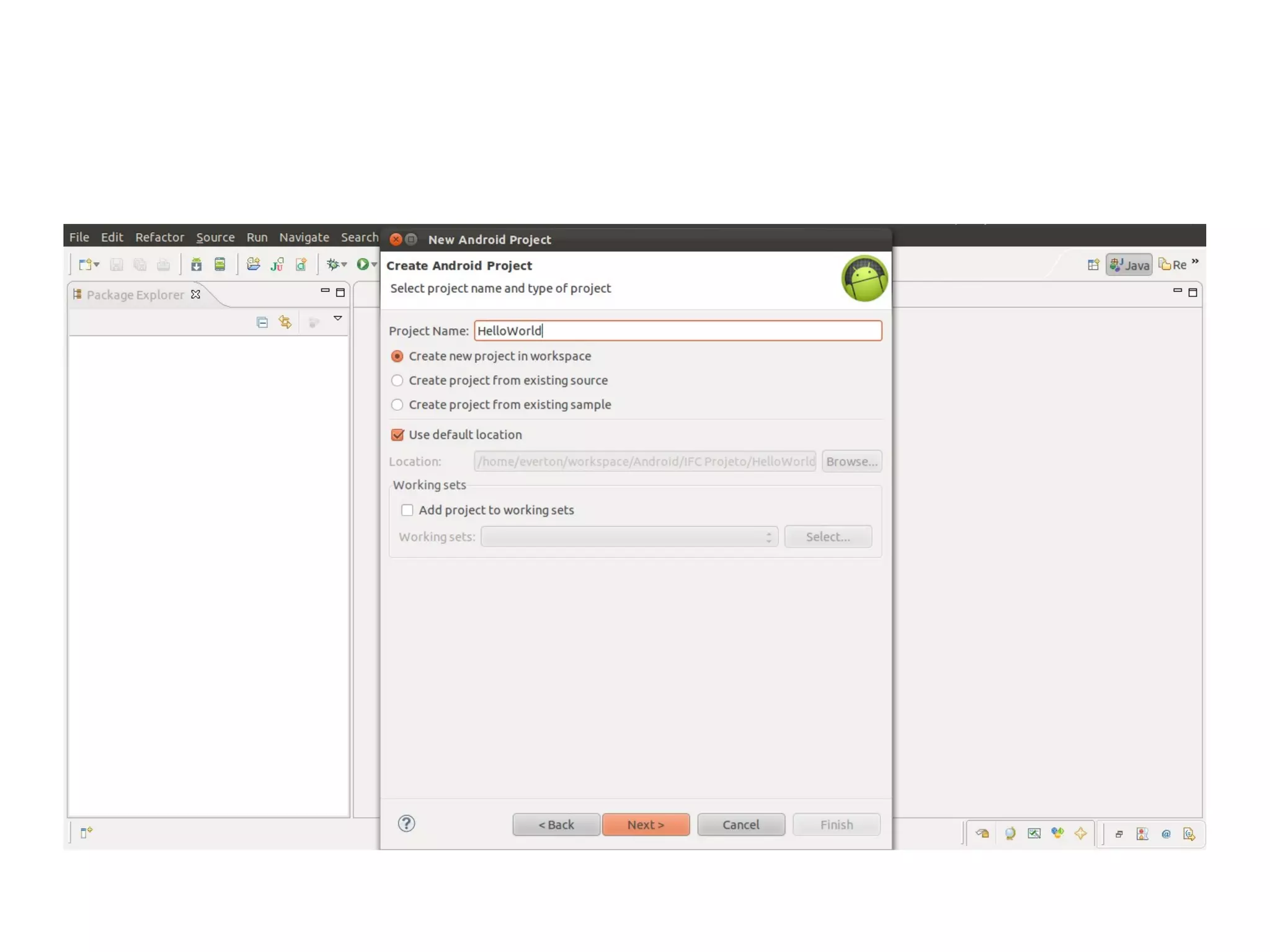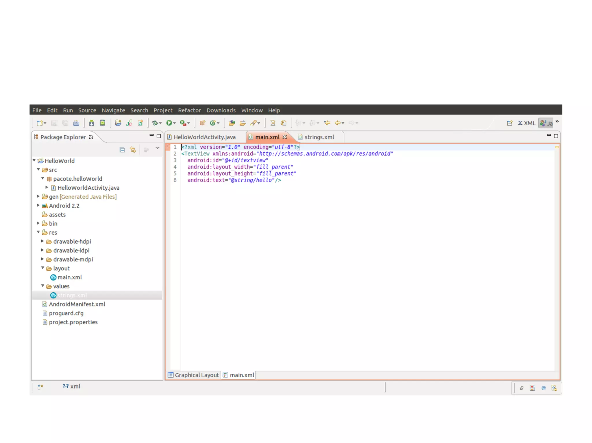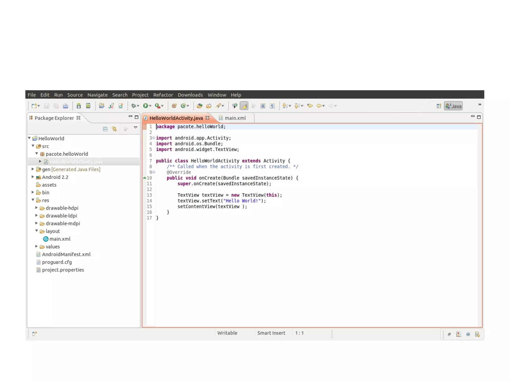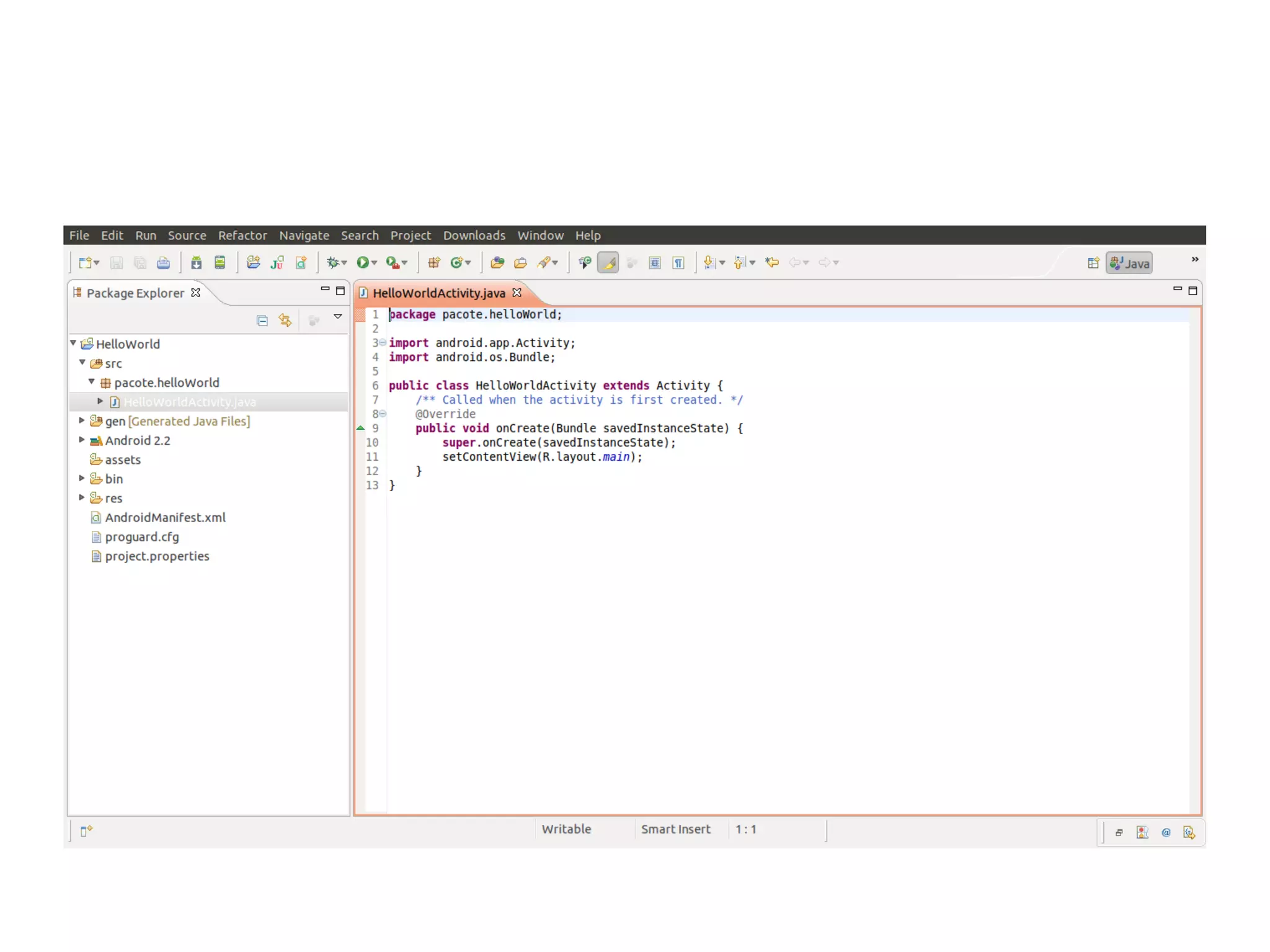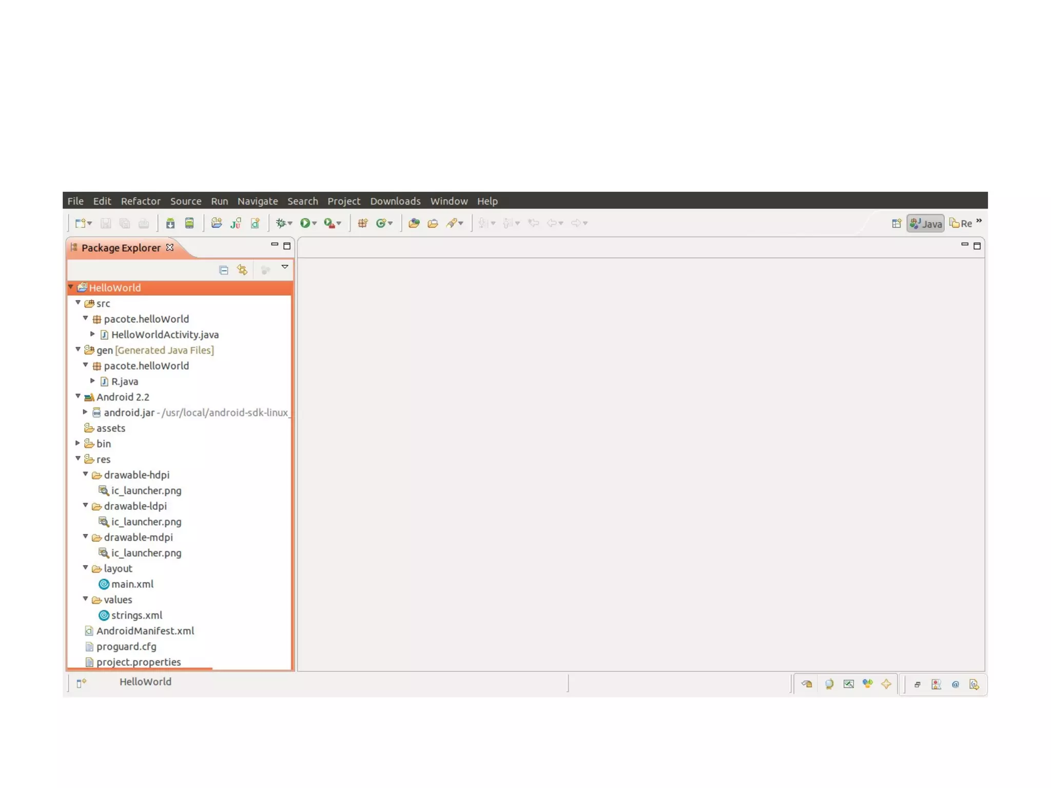 O documento descreve a criação de um projeto Android básico chamado 'hello world' usando a IDE Eclipse, abordando aspectos como a estrutura do projeto, a implementação de uma activity e o ciclo de vida dela. Ele também explora a utilização de layouts XML para separar a lógica da apresentação. Por fim, menciona a geração automática do arquivo r.java, que funciona como um índice dos recursos do projeto.