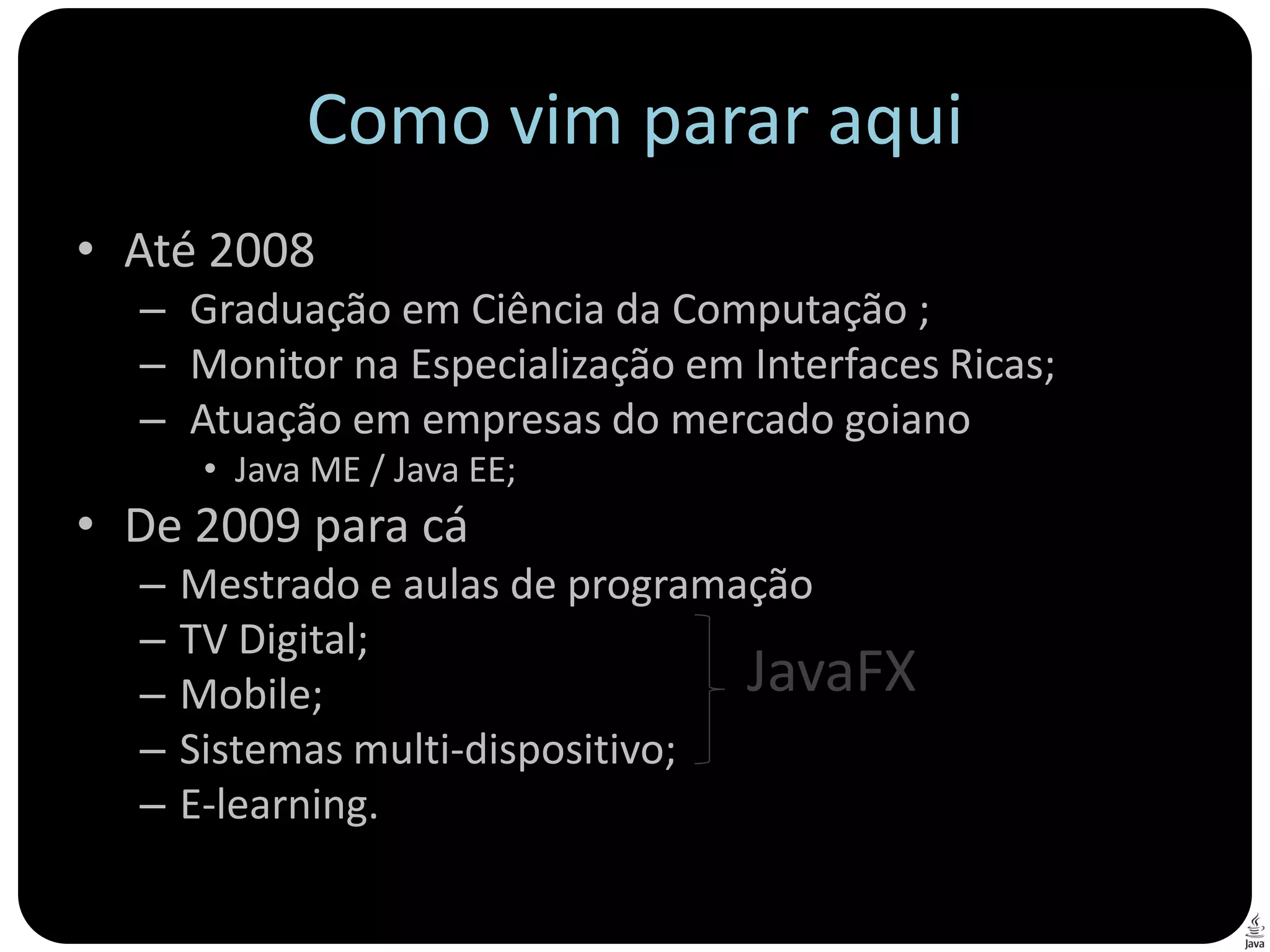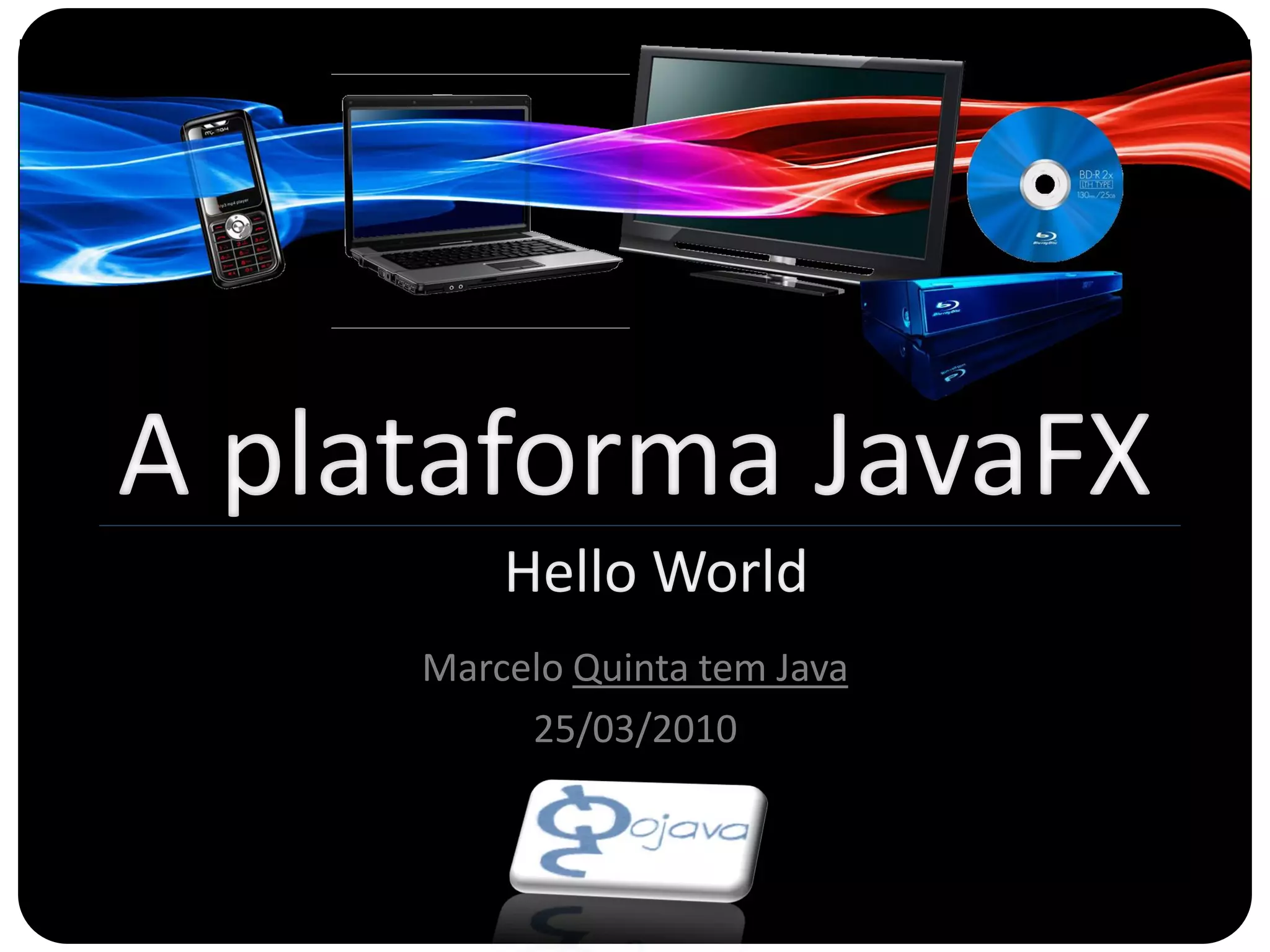 A apresentação discute a plataforma JavaFX, destacando suas funcionalidades na criação de aplicações com interfaces ricas que operam em diversos dispositivos e sistemas operacionais. Enfatiza a importância da colaboração entre designers e desenvolvedores, bem como as ferramentas disponíveis para ambos. O documento também fornece recursos e links úteis para aprendizado e desenvolvimento em JavaFX.