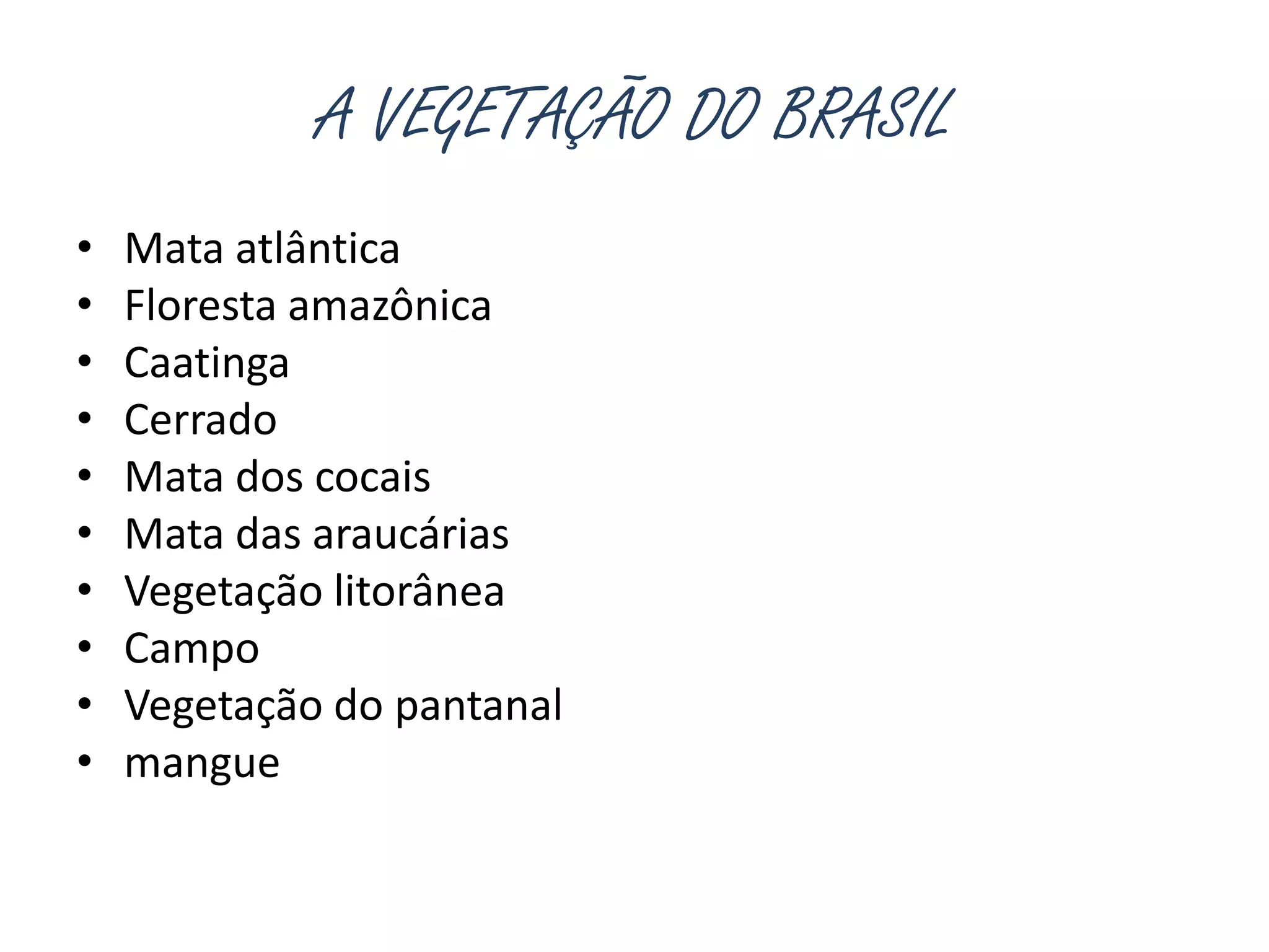 O documento lista e descreve brevemente os principais biomas e formações vegetais do Brasil, incluindo a Mata Atlântica, a Floresta Amazônica, a Caatinga, o Cerrado, a Mata dos Cocais, a Mata das Araucárias, a Vegetação Litorânea, o Campo, a Vegetação do Pantanal e o Mangue.