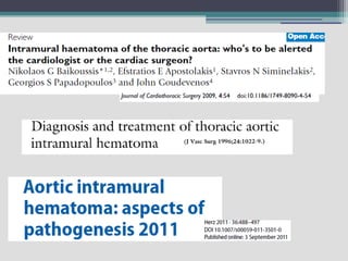 O documento discute hematoma intra-aórtico, incluindo sua patogenia, classificação, epidemiologia, diagnóstico, história natural e tratamento. O caso apresentado envolve um paciente com hematoma intra-aórtico pós-angioplastia que apresenta dor recorrente e questões sobre seu tratamento com bloqueadores beta e anticoagulação.