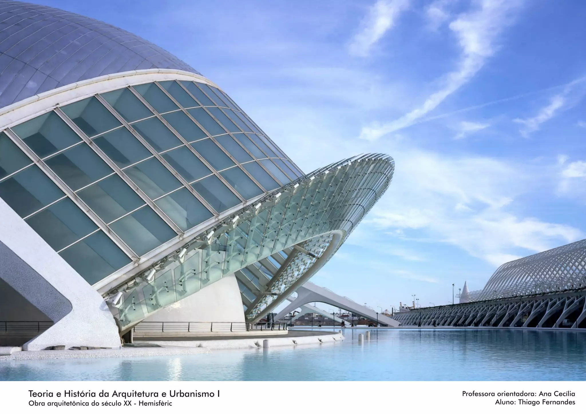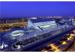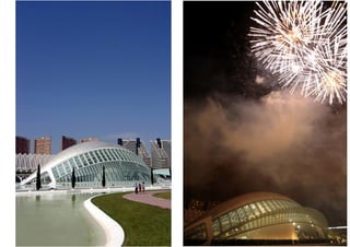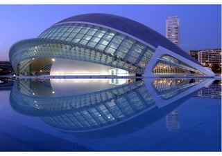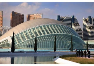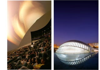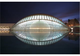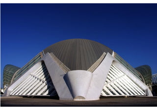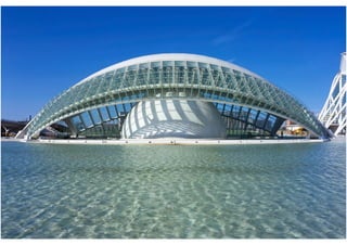 O documento descreve a obra arquitetônica Hemisféric projetada por Santiago Calatrava em Valência, Espanha em 1998. Faz parte do complexo Cidade das Artes e das Ciências de Valência, que inclui o Museu de Ciências Príncipe Felipe, o Palácio das Artes Rainha Sofia, a Ágora e o Oceanográfico. O Hemisféric é um planetário e cinema IMAX com estruturas metálicas móveis laterais que proporcionam uma concepção estética dinâmica e única.