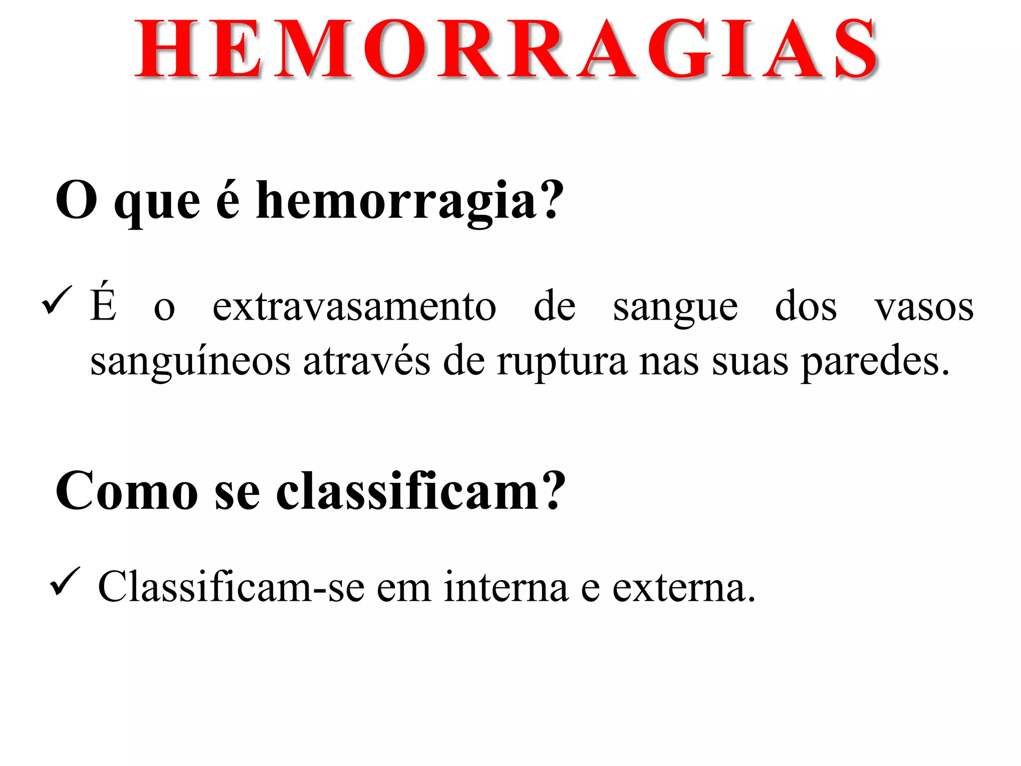 O documento descreve os tipos de hemorragia, incluindo arterial, venosa e capilar. As hemorragias podem ser internas ou externas. Os fatores que determinam a gravidade de uma hemorragia incluem o volume de sangue perdido, o calibre do vaso rompido e o tipo de vaso lesado.