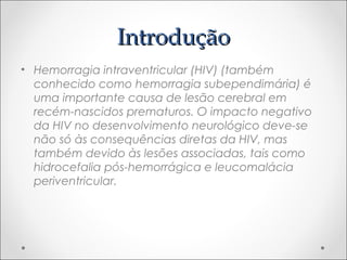 1. A hemorragia intraventricular (HIV) é uma importante causa de lesão cerebral em recém-nascidos prematuros, mas atualmente não há terapias específicas para limitar sua extensão ou complicações como hidrocefalia pós-hemorrágica.