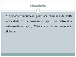 [1] A velocidade de hemossedimentação (VHS) mede a taxa de sedimentação de hemácias em sangue anticoagulado em um tubo graduado. [2] O método padrão é o de Westergren, que usa sangue com citrato de sódio e mede a sedimentação em 1 hora. [3] Valores acima de 100 mm/h indicam infecção, câncer ou doenças inflamatórias e requerem investigação.