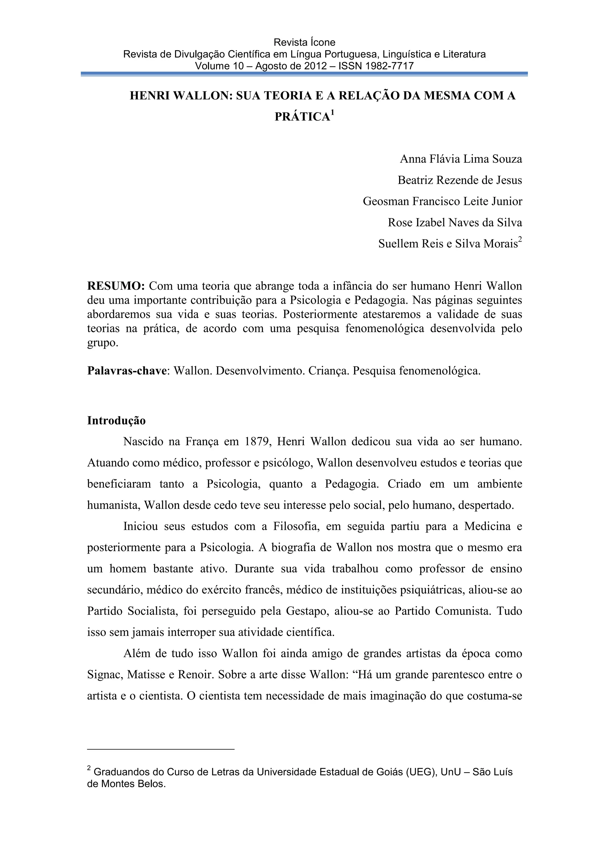 O documento discute a teoria do psicólogo francês Henri Wallon sobre o desenvolvimento infantil. Wallon propôs que o desenvolvimento ocorre em estágios, incluindo o estágio impulsivo-emocional, o estágio sensório-motor e projetivo, e o estágio do personalismo. Sua teoria enfatiza a integração dos aspectos cognitivos, afetivos e motores na formação da criança.