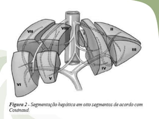 O documento descreve a anatomia e vascularização do fígado, indicações e contraindicações para hepatectomia, avaliação pré-operatória, técnicas cirúrgicas como clampeamento vascular e diferentes tipos de hepatectomia, incluindo por videolaparoscopia.