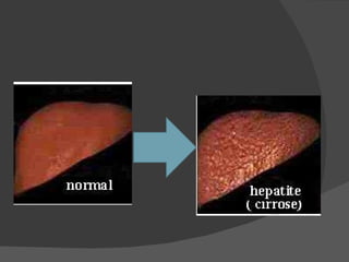 Hepatite é uma degeneração do fígado causada principalmente pelos vírus A, B e C. A hepatite A é transmitida por água e alimentos contaminados e entre pessoas, enquanto as hepatites B e C são transmitidas principalmente pelo sangue e contato sexual. Os sintomas da hepatite A incluem febre, icterícia e desconforto abdominal, enquanto as hepatites B e C geralmente não apresentam sintomas, mas podem se tornar crônicas. A prevenção inclui saneamento básico, vacina contra hepatite B e