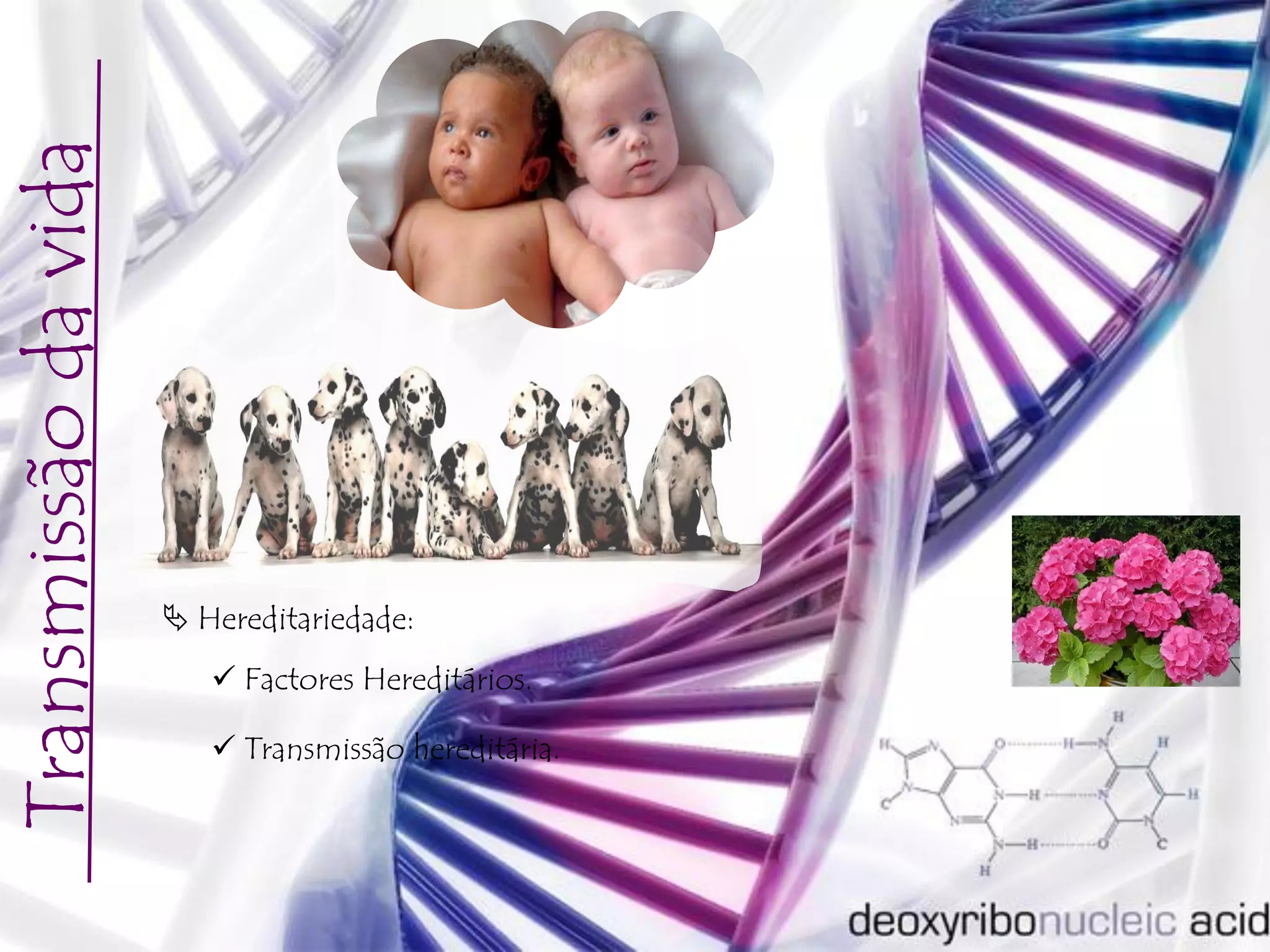 O documento discute conceitos básicos de hereditariedade, incluindo a transmissão de características genéticas de pais para filhos, os experimentos de Mendel que estabeleceram os princípios da hereditariedade e a transmissão do material genético no DNA.