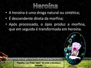 A heroína é uma droga derivada da morfina, que é extraída do ópio da papoula. Foi introduzida como substituto da morfina em 1898, mas tornou-se ilegal em 1924 devido aos seus fortes efeitos viciantes. Os principais métodos de administração são injeção ou inalação, causando euforia inicialmente mas levando a dependência química e física com o uso contínuo.