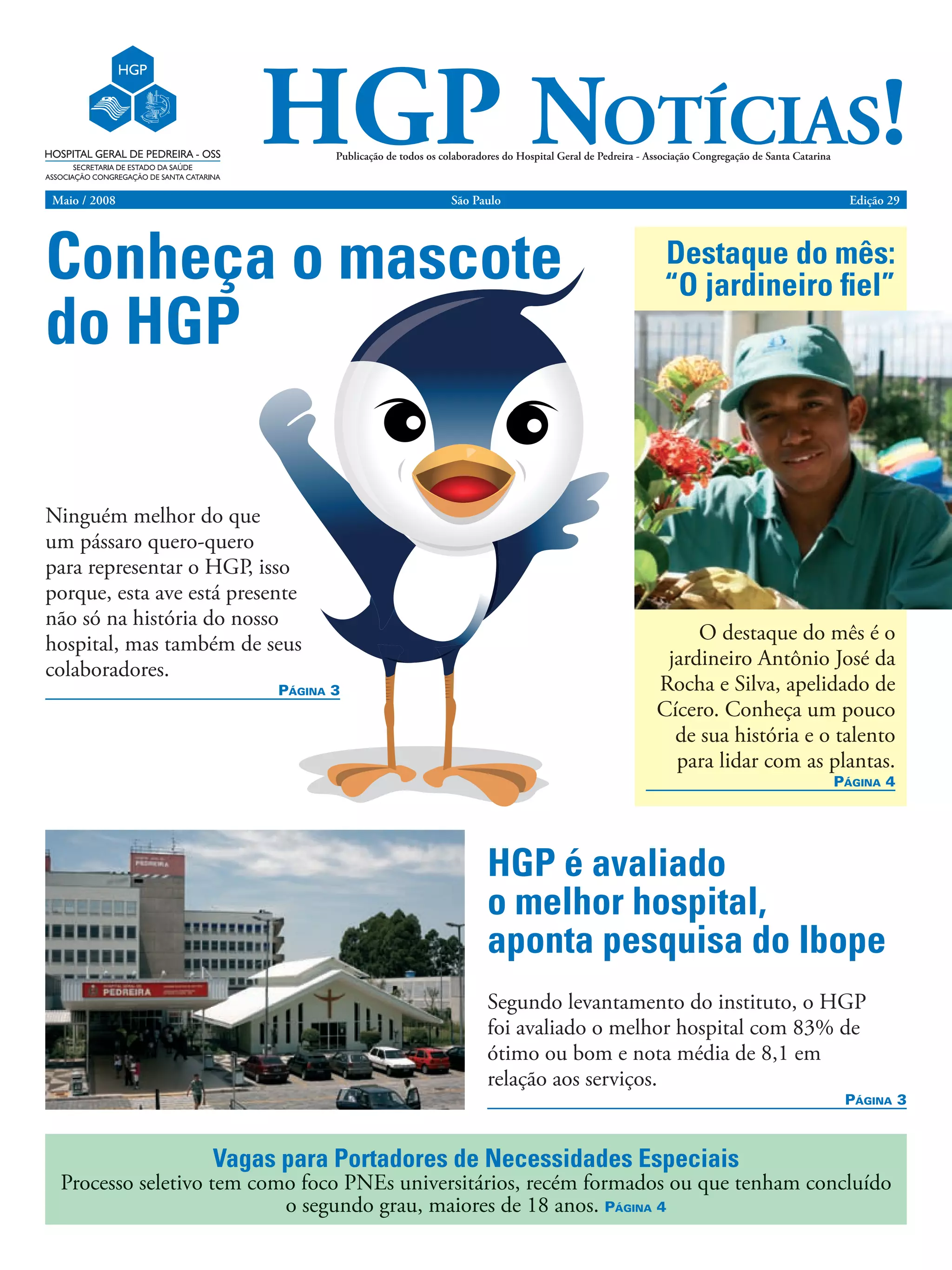 1) O documento apresenta as novidades da 29a edição do jornal HGP Notícias, incluindo a nova identidade visual e periodicidade mensal.