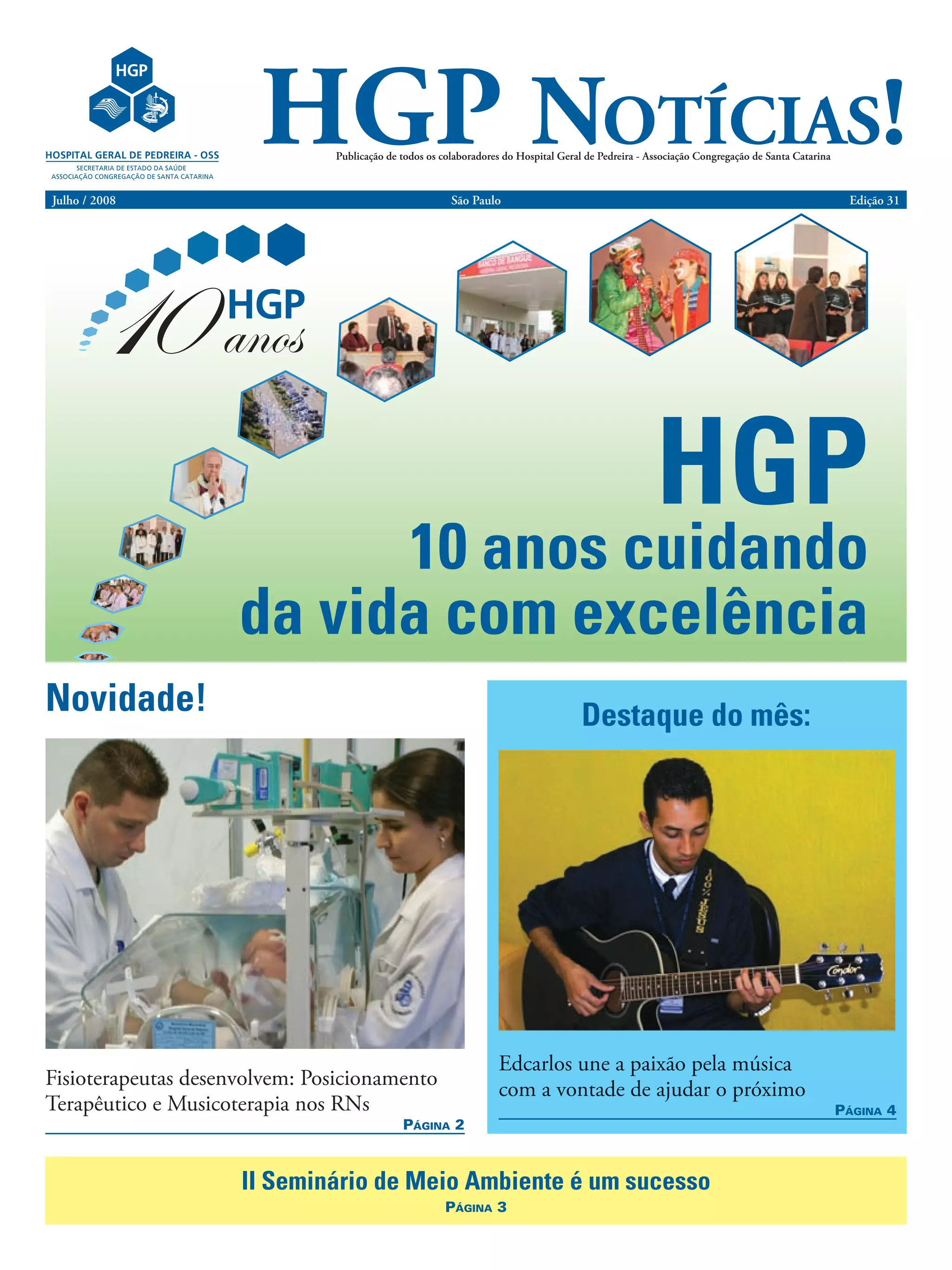 O documento resume as comemorações dos 10 anos do Hospital Geral de Pedreira, incluindo uma semana de atividades com missa, inauguração do banco de sangue e festa junina. Também destaca projetos de fisioterapia com recém-nascidos e o sucesso do segundo seminário de meio ambiente realizado na instituição. Por fim, apresenta a história de Edcarlos, que une paixão pela música e vontade de ajudar crianças carentes com aulas de violão.