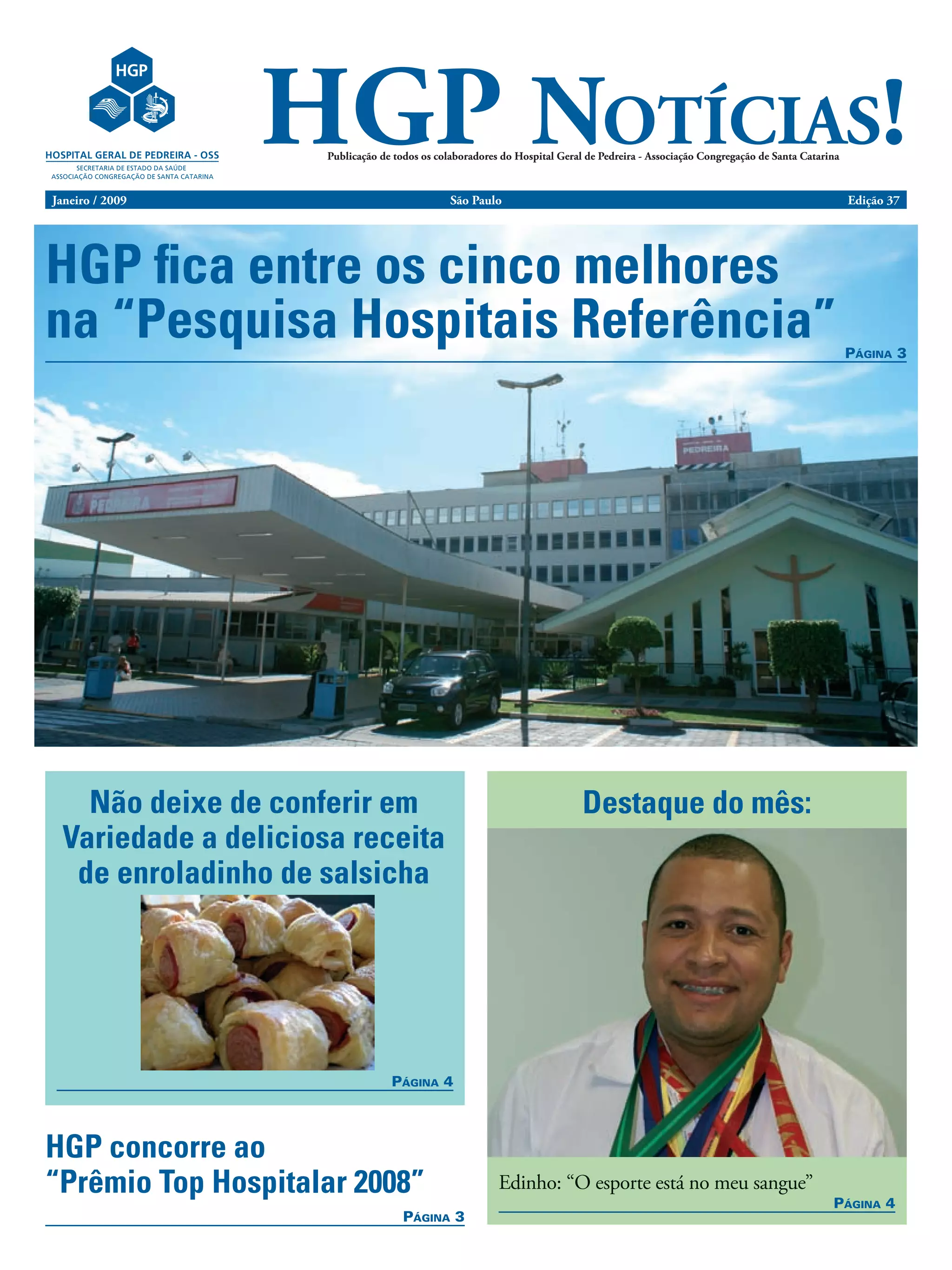 O documento relata que o HGP ficou entre os cinco melhores hospitais na "Pesquisa Hospitais Referência" e concorre ao "Prêmio Top Hospitalar 2008". Além disso, destaca a receita de enroladinho de salsicha e a trajetória do funcionário Edinho, apaixonado pelo esporte.