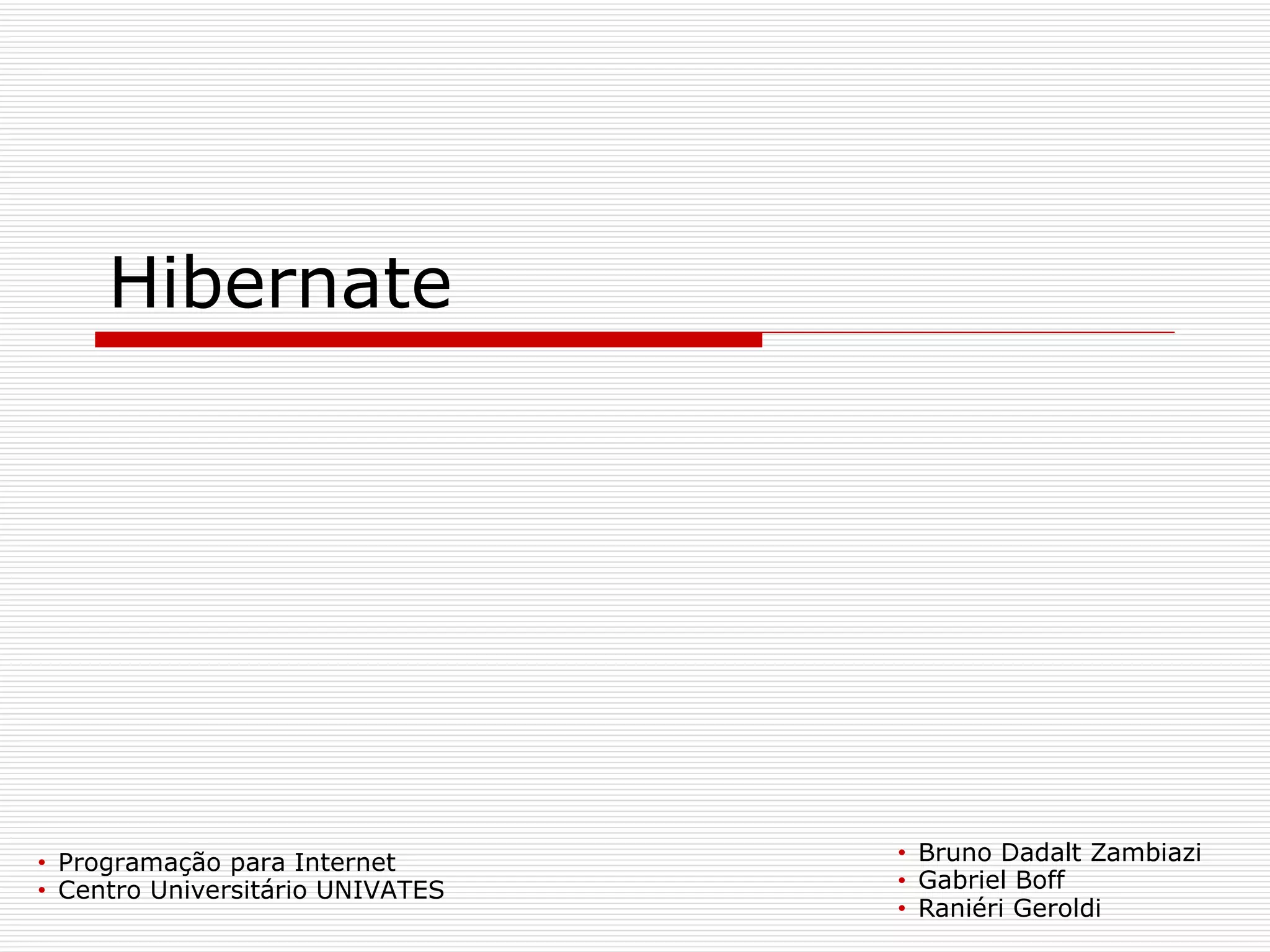 Hibernate é um framework de mapeamento objeto-relacional criado em 2001 por Gavin King que visa diminuir a complexidade no tratamento de dados entre objetos e bancos de dados relacionais mapeando classes a tabelas. Ele gera automaticamente o schema do banco, permite consultas através de HQL ou Criteria e define três estados para objetos: transientes, persistentes e detached.