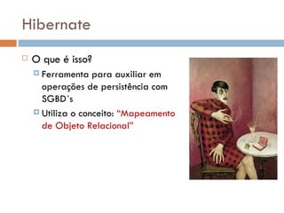 O documento descreve o que é o Hibernate, um framework de mapeamento objeto-relacional para Java que mapeia classes Java para tabelas de banco de dados. Ele explica os conceitos básicos de mapeamento objeto-relacional e fornece um exemplo inicial de como configurar e usar o Hibernate para salvar objetos no banco de dados.