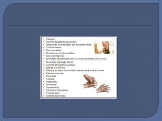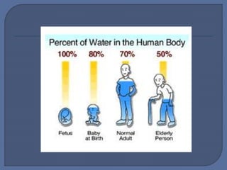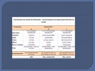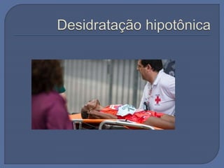 O documento discute a hidratação e desidratação no corpo humano. Apresenta os tipos de desidratação (isotônica, hipertônica e hipotônica), sinais e sintomas associados a cada tipo, além de parâmetros para classificar a gravidade da desidratação (leve, moderada ou grave).