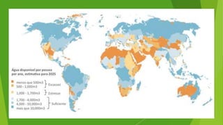 O documento discute conceitos-chave da hidrografia, incluindo a distribuição global e desigual da água, aquíferos, rios e bacias hidrográficas. Também aborda fossas sépticas e seus impactos na poluição das águas subterrâneas, além de fornecer exemplos de bacias hidrográficas brasileiras como a Amazônica e a do rio São Francisco. A atividade final pede aos estudantes que respondam questões sobre o assunto no livro didático.