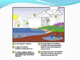O documento discute a hidrografia no Brasil, incluindo o ciclo da água, distribuição de água no planeta, oceanos, lagos, geleiras, águas subterrâneas, aquíferos, bacias hidrográficas, rios e poços no Brasil.