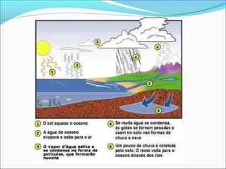 O documento discute a hidrografia, abordando conceitos como ciclo da água, distribuição da água no planeta, oceanos, lagos, geleiras, águas subterrâneas, aquíferos, bacias hidrográficas, tipos de rios, e hidrografia de Pernambuco. O texto fornece detalhes sobre esses tópicos e inclui imagens ilustrativas.