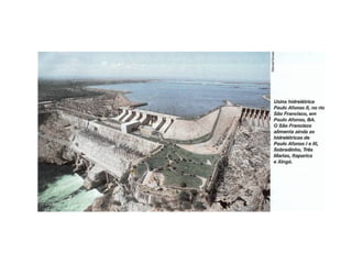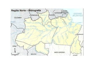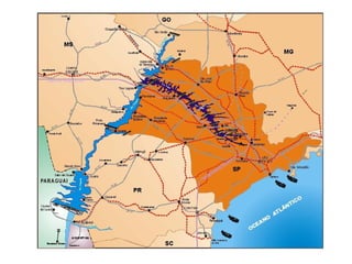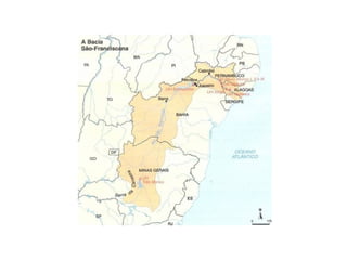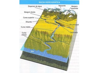 O documento descreve as principais bacias hidrográficas do Brasil, incluindo a Bacia Amazônica, a maior bacia hidrográfica do planeta; a Bacia do São Francisco, importante para o desenvolvimento da região semi-árida nordestina; e a Bacia Platina formada pelas bacias do Paraná, Paraguai e Uruguai, importantes para a geração de energia hidrelétrica e navegação.