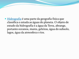 Este documento discute os principais conceitos da hidrografia, incluindo o ciclo da água, as diferentes formas de água no planeta (águas continentais, subterrâneas, oceanos, mares, lagos, rios e geleiras), e como essas águas se relacionam no ciclo hidrológico.