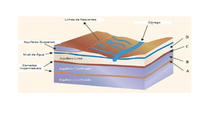 O documento discute a hidrografia e o ciclo hidrológico, incluindo a distribuição da água na Terra, os tipos de rios, mares e correntes oceânicas, e as águas subterrâneas em aquíferos. Ele fornece diagramas ilustrativos e exemplos de características hidrológicas em diferentes regiões.