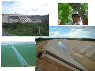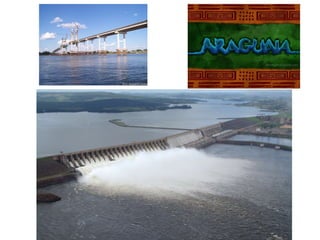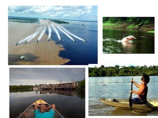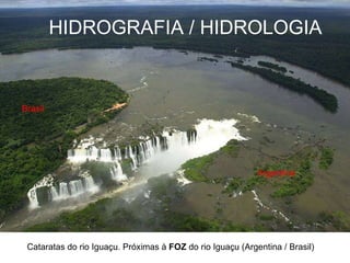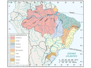 O documento descreve as principais bacias hidrográficas do Brasil, incluindo a Amazônica, a maior bacia do mundo; a bacia do São Francisco, importante para irrigação; e a bacia do Paraná, que possui as maiores hidrelétricas como Itaipu. O texto também fornece detalhes sobre conceitos hidrológicos como nascentes, foz, afluentes, meandros, jusante, montante e margens.