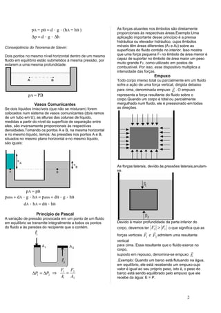1) O documento discute conceitos fundamentais de hidrostática, incluindo pressão hidrostática, densidade, empuxo e suas relações.