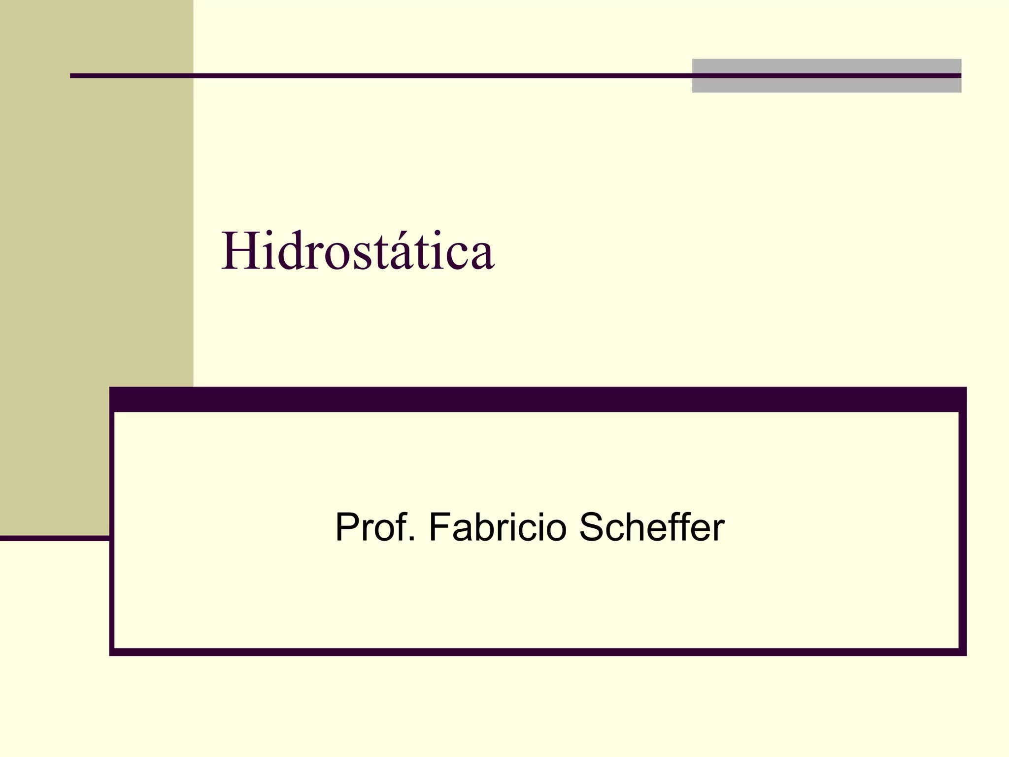 1) O documento discute conceitos fundamentais de hidrostática, incluindo massa específica, densidade, pressão, pressão hidrostática, princípio de Pascal e princípio de Arquimedes.