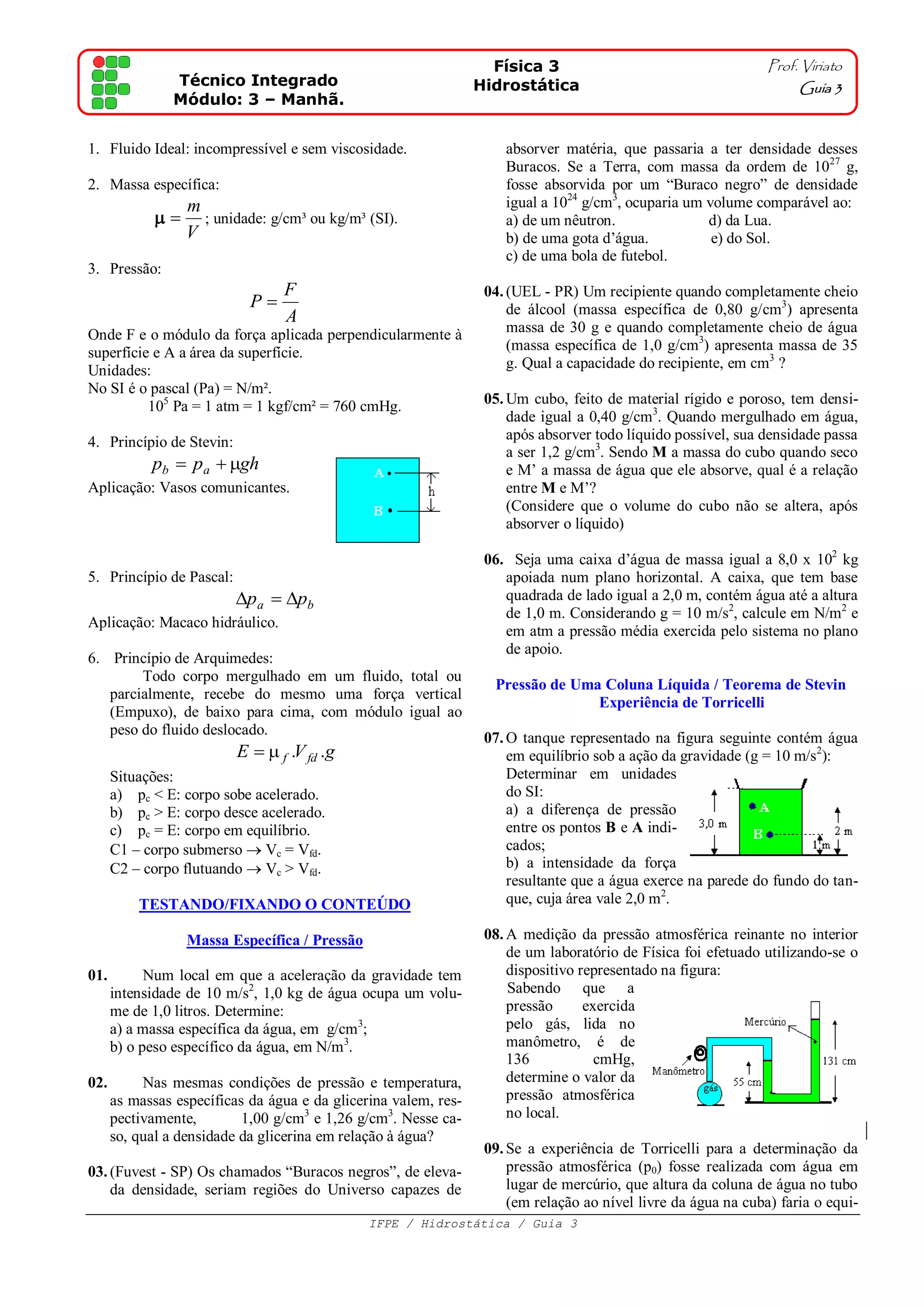 1. O documento apresenta questões sobre hidrostática, abordando tópicos como massa específica, pressão, princípios de Pascal, Stevin e Arquimedes, além de vasos comunicantes e flutuação.