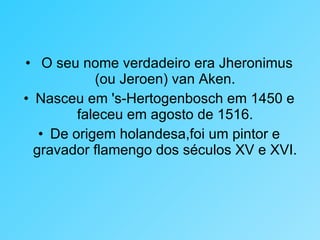 Hieronymus Bosch foi um pintor e gravador flamengo dos séculos XV e XVI nascido em 's-Hertogenbosch. Suas obras fantásticas e diabólicas criticavam os vícios, pecados e temores religiosos da época através de um tom satírico. Algumas de suas principais obras incluem O Jardim das Delícias Terrenas, As Tentações de Santo Antão e o Navio dos Loucos.