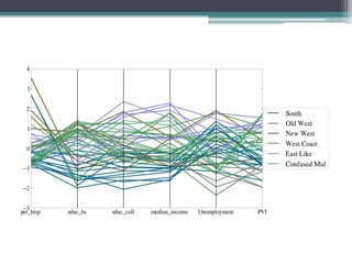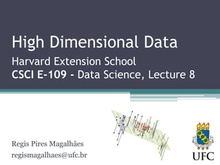 O documento discute técnicas para lidar com dados de alta dimensionalidade, incluindo redução de dimensionalidade linear como PCA e não-linear como Isomap. Exemplos demonstram como PCA pode ser usado para reduzir a dimensionalidade de imagens de rostos e documentos de texto, preservando a maior parte da variância. Métodos não-lineares são necessários quando os dados não são linearmente separáveis.